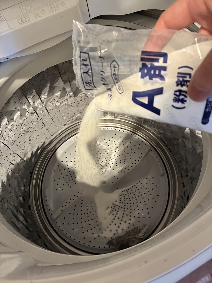 早速、空の洗濯槽にA剤を投入!全体に薬剤が行きわたるように入れた方がなんか良いような気がしました。(笑)それでは、いざ洗浄へ!!