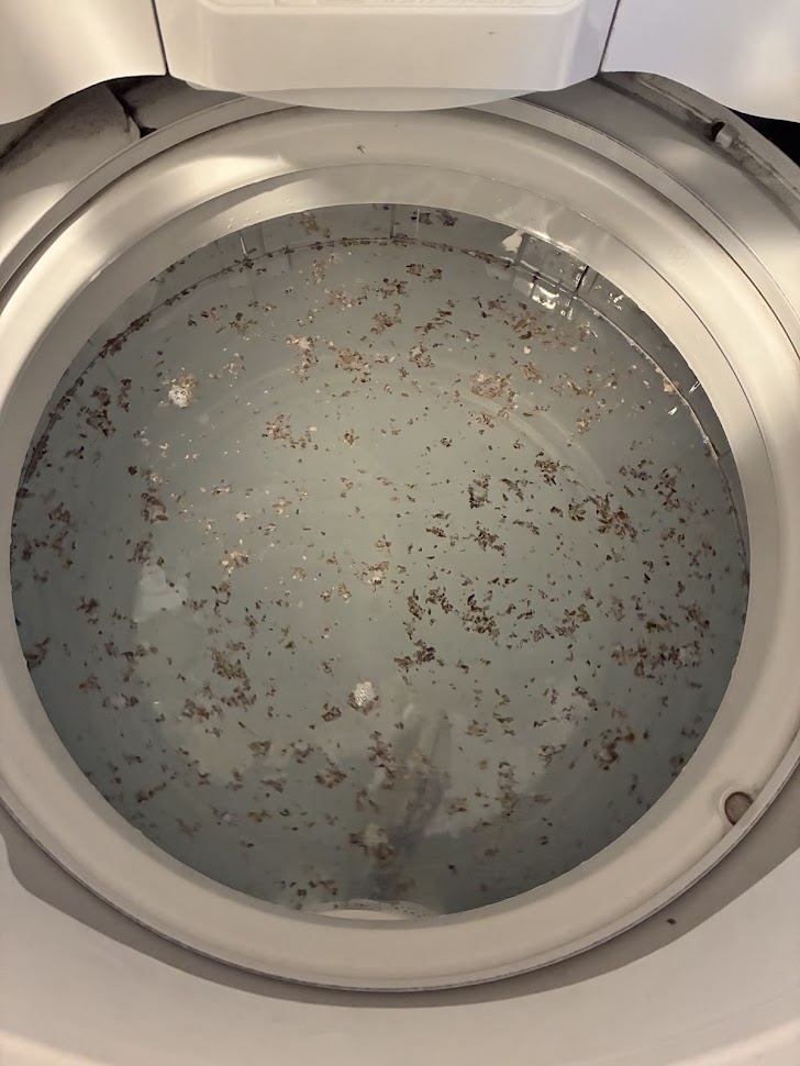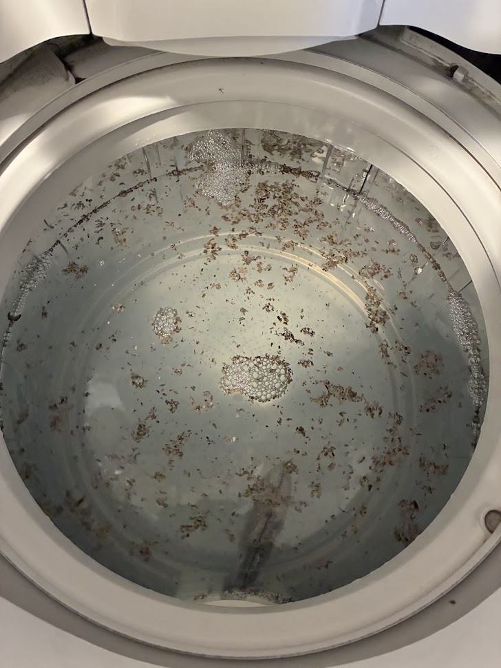 この後すすぎをするのですが、そのまま脱水まで行くと洗濯槽の底にに結構のカビが残ってしまいます。
